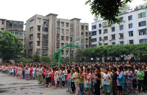 康水灵同学和小姨一起接受来自南溪一中的捐赠,前进小学全体师生共同见证整个捐赠活动过程。