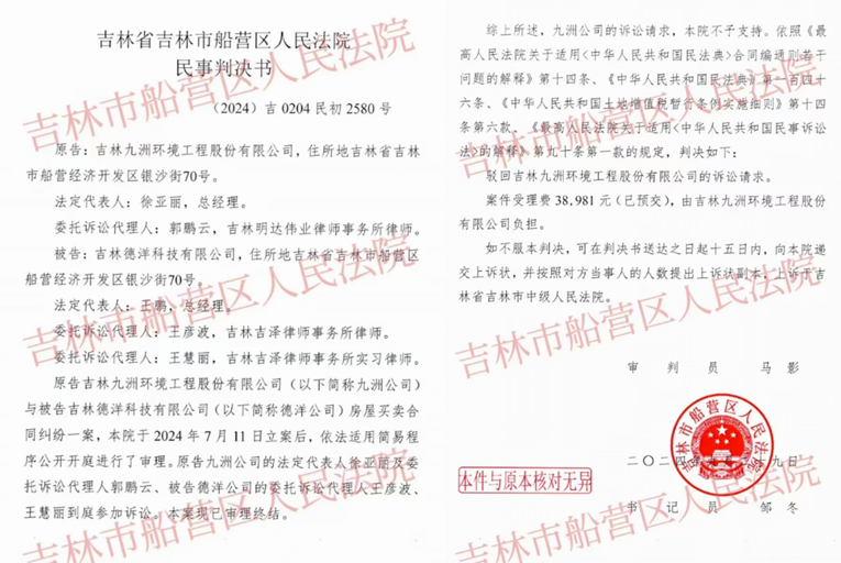 2024年7月11日,吉林省吉林市船营区人民法院受理了一起因房屋买卖合同纠纷引发的诉讼案。原告吉林九洲环境工程股份有限公司(以下简称:九洲公司)起诉被告吉林德洋科技有限公司(以下简称:德洋公司),请求支付购房款7761633.21元及利息。