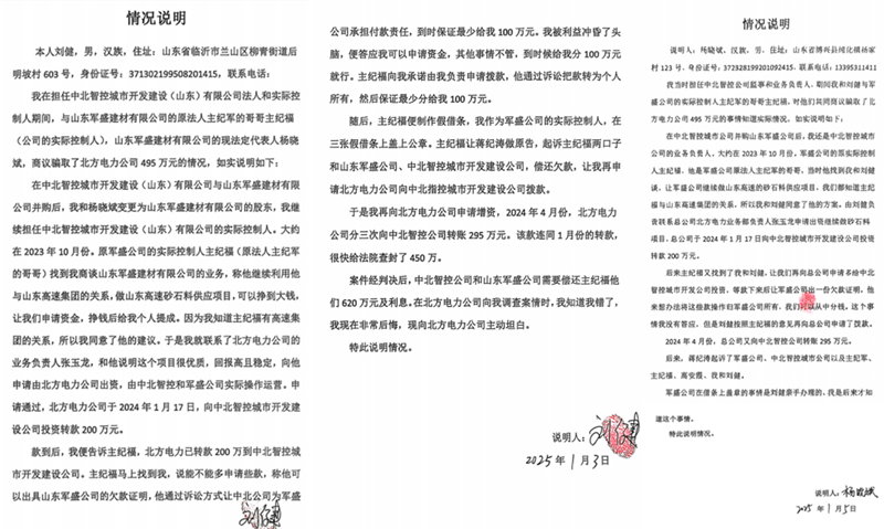 我司调查期间,刘健、杨晓斌因畏惧法律制裁,出具书面坦白材料,承认:借据系主纪福伪造,公章由刘健私自加盖;所谓“债务”是主纪福为侵吞北方电力资金,拼凑他人转账记录虚构而成;虚假诉讼的目的是通过司法程序将资金据为己有!